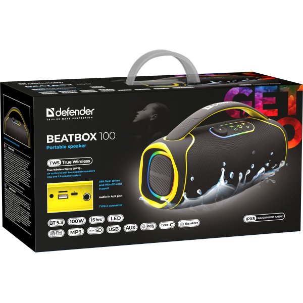 DEFENDER PORTABLE BLUETOOTH SPEAKER BEATBOX 100 black BT/FM/USB/TF/AUX/Light